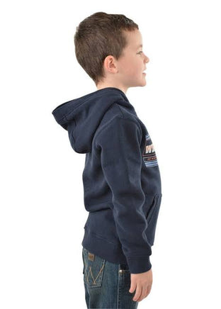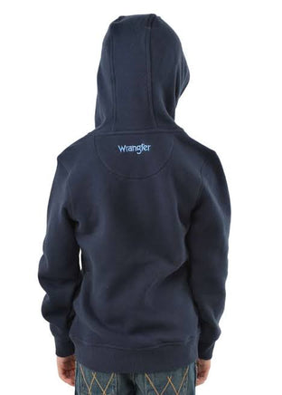 Heavyweight brushed fleece pullover, large front feature Wrangler print, hood with contrast lining, front kanga patch pocket, rib trim hem and cuffs