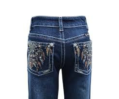 34 Inch leg - boot cut, stretch for comfort, mid rise, logo shank button, diamante rivets, woven logo badge on back yoke, PW embroidery on coin pocket, feature embroidery on back pockets and front scoop pockets, contrast all over topstitch