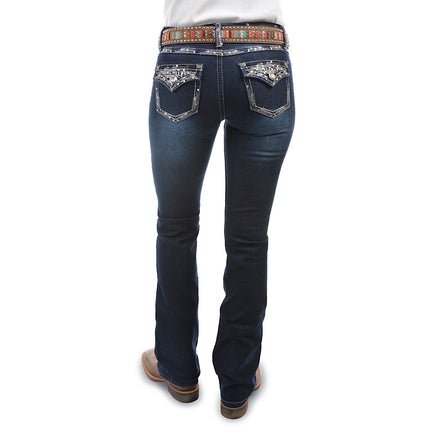 34" Leg, stretch for comfort, mid rise, logo shank button, mock leather logo badge on back waistband, feature flap back pocket and topstitch detail