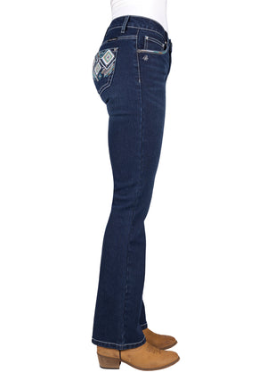 32” leg - boot cut; stretch for comfort and movement; mid rise; logo shank button; diamanté rivets; woven logo label on back yoke; PW embroidery on front pocket; contrast all over topstitch