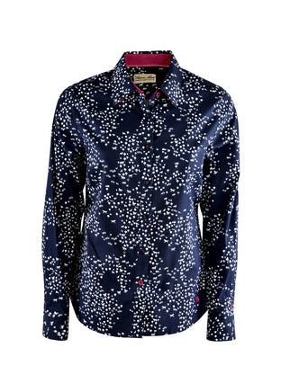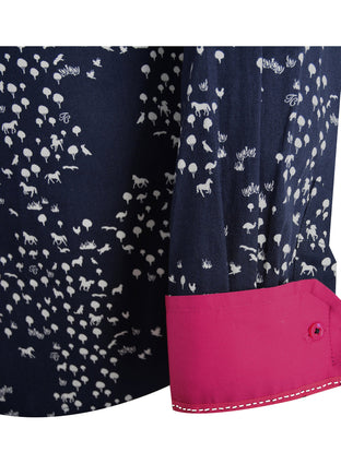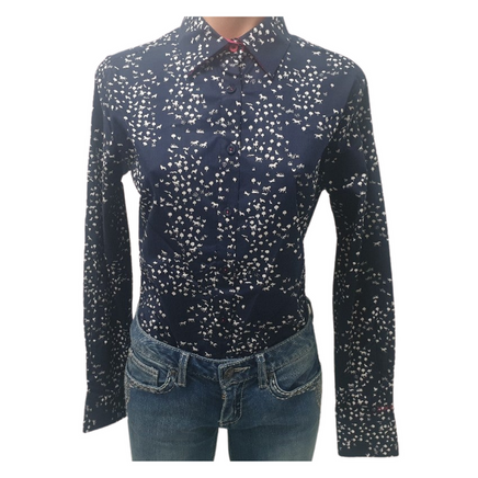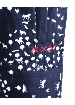 Thomas Cook original print, bust darts, grosgrain trim, criss cross embroidered cuff pleats,  embroidery at side hem, collar stays, stretch for comfort.