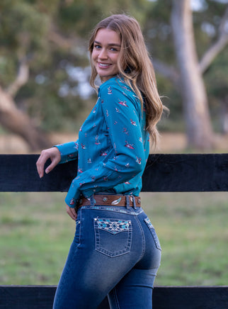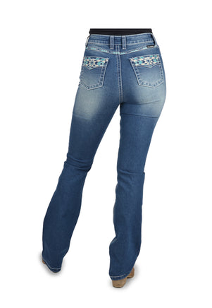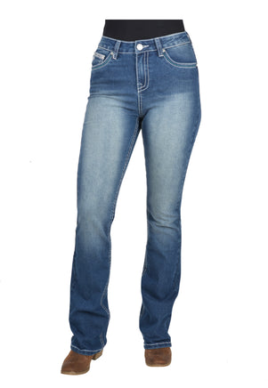Features: 34” leg - boot cut, stretch for comfort, high rise, logo shank button, diamanté rivets, woven logo label at back yoke, feature embroidery on back pockets, back yoke, front scoop pockets and coin pocket, PW embroidery on coin pocket, contrast all over topstitch