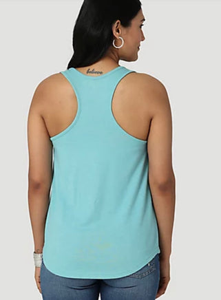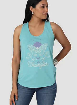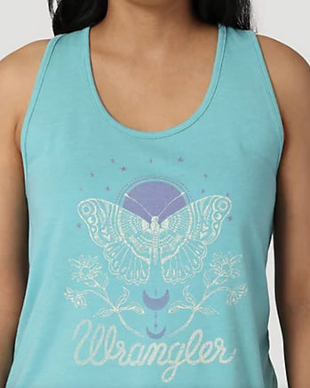 Cowgirls can be spiritual gangsters too. Our women's Wrangler Retro® celestial moth racerback tank combines Western aesthetics and the symbolism of transformation for a look that's ready to take on summertime. It's crafted from a light and airy cotton blend that will keep you cool when it starts to heat up. This tank top features a colorful print of a moth, moons, and flowers