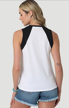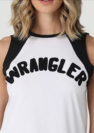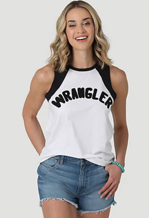 Offering a feminine take on the classic muscle tee, our Wrangler Retro® vintage logo raglan tank is ready for a summer you'll never forget. Going back to the basics, this tank features a black-and-white color scheme that really pops when paired with denim. It comes with the logo you know and love across the chest and black trim at the shoulders for a contrasted look. Plus, it's crafted from 100% cotton for an airy feel that will keep you cool all summer long.