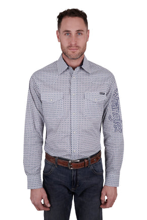 Classic western long sleeve shirt, snap closure, western chest pockets (one with pen holder), western front and back yokes, contrast trim on inside collar stand, Wrangler® iconic logo sleeve embroidery