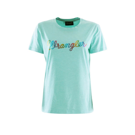 Large front feature Wrangler® iconic logo rainbow metallic print, Wrangler® iconic logo back neck metallic print, Wrangler® iconic logo pip label on side seam.