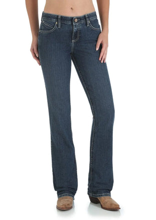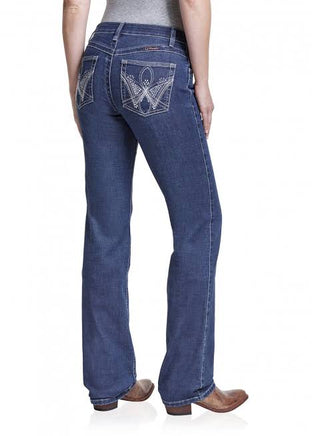 Sits below waist, No Gap elastic waistband, flat seams, angled patch watch pocket, two front scoop pockets, comfort fit seat and thigh, boot cut, Booty Up technology, double yoke adds lift, built in darts to lift and define your butt, flatters curves