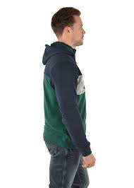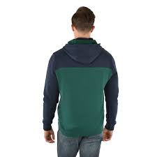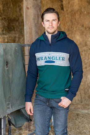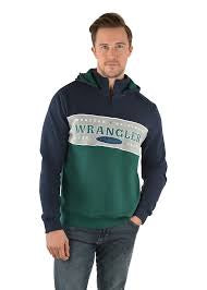 Lightweight French terry pullover with hood, 1/4 zip neck, cut n sew contrast paneling with piping detail, large front feature Wrangler embroidery, rib trim hem and cuffs