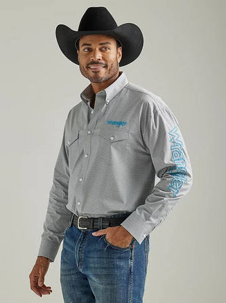 Wear the look of a champion with this distinguished logo shirt. It's crafted of soft, top-quality fabric with the Wrangler® logo embroidered boldly in several key places. A spread collar, Western back yoke and snap flap front pockets cap off the impressive style.