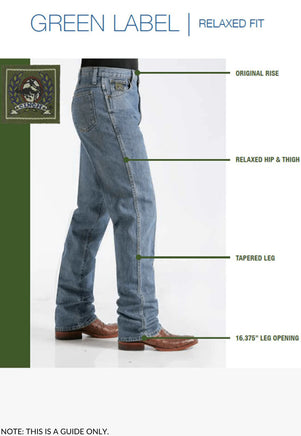 Cinch Men's Jeans are designed to be durable, tough and most importantly comfortable. The Cinch Green Label Relaxed Fit Jeans are designed as an original rise, tapered leg relaxed jean. Made from 14.25 oz. of denim.