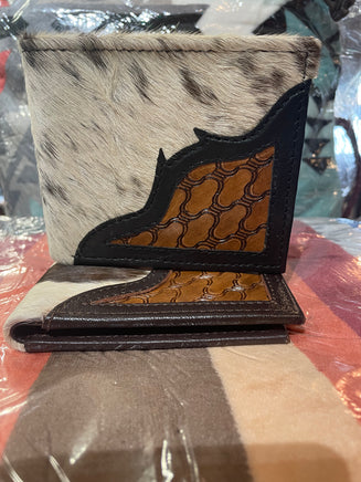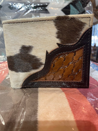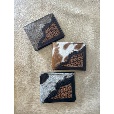 Mens tooled cowhide wallets Our new collection of mens tooled wallets! Each wallet is one of a kind with each cowhide color different! Also a tooled edge for style and character! Made of genuine leather and high quality hair on hide. Measures: 4.5” closed x3.5 height Open: 9”Details