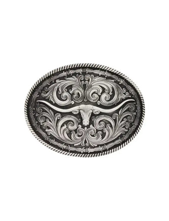 In this oval shape classic antiqued silver-tone Attitude belt buckle, a longhorn steer head relief figure with a horns curved upward is set on a background of sweeping filigree engraving. No picture can do justice to the beautiful shine and brilliance brought out by the dark antiquing. Twisted rope trim. Standard 1.5 inch belt swivel.