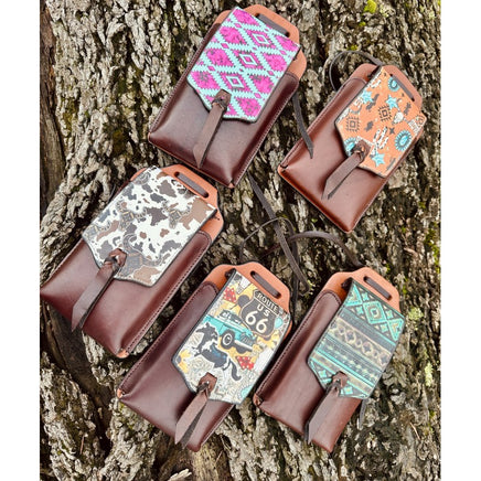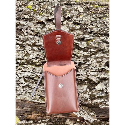 All leather back cinch cell phone holder with snap closure, big enough to fit IPhone max pro with decorative leather flap with tie detail. Back strap fits on thru a back cinch billet and the leather strings tie to the d ring