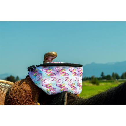 Insulated Nylon Saddle Pouch, same design as our best selling beat bag just without the beats, a beatless bag you might say. Includes convenient pocket that is ideal for your phone, keys, money, snacks, etc. Simply clip the Saddle Pak to the pommel of your saddle with two buckles or to your belt loops or english saddle with the 2 clips. Measures 9" long by 4" wide by 5" tall.
