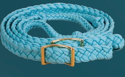 Mustang® Braided Barrel Racing Reins, Flat 3/4" x 8' braided barrel rein with four easy grip knots and brass plated hardware. Plaited to round in the centre. Nickel plated trigger snap. Colours available: Black, Blue, Blue/Lime, Blue/Orange, Black/White, Hot Pink/Lime Green, Hot Pink, Pink/Black, Purple, Purple/Lime, Red, Turquoise/Pink