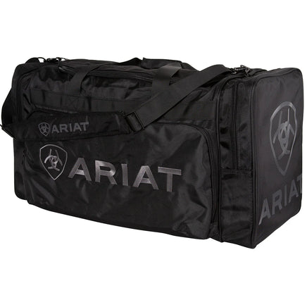 Pockets on each end, front pocket with Ariat Logo, detachable shoulder strap, top zip opening to main compartment.