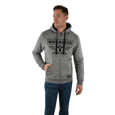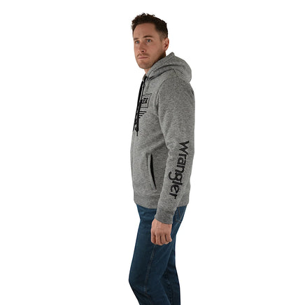 Heavyweight brushed fleece jacket, sherpa-lined hood and body for warmth, quilted back yoke, front chest flocking and back neck embroidery, large wrangler logo sleeve embroidery, quilted sleeve lining, side welt pockets with zips, rib cuffs and hem band