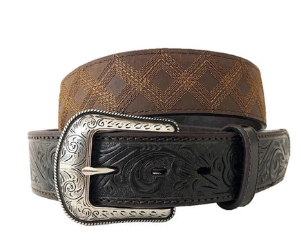 Genuine leather, brown with stitched diamond design and floral hand-tooled leather end tabs, antique nickel buckle, 1 1/2"(38mm) wide