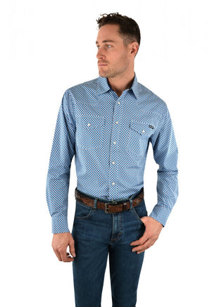 Features: Classic western styling with small geometric print, snap closure, western chest pockets one with pen holder , western front and back yoke, contrast trim on inside collar stand and sleeve cuffs