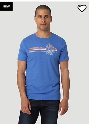 A perfect match for your favorite jeans, this Wrangler® short-sleeve t-shirt will add a colorful Western feel to your everyday rotation. It's crafted from a lightweight blend for comfort that can't be beat. This classic crewneck features a regular fit through the arms and body for just the right amount of room. It comes with a retro-inspired chest print of a desert mountain range and the Wrangler script logo for a touch of authenticity.